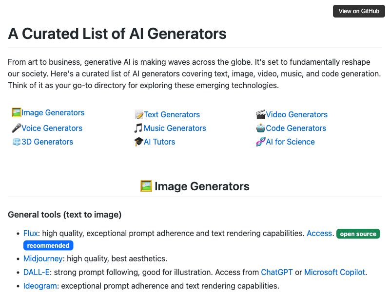 From art to business, generative AI is making waves across the globe. It's set to fundamentally reshape our society. Here's a curated list of AI generators covering text, image, video, music, and code generation. Think of it as your go-to directory for exploring these emerging technologies.